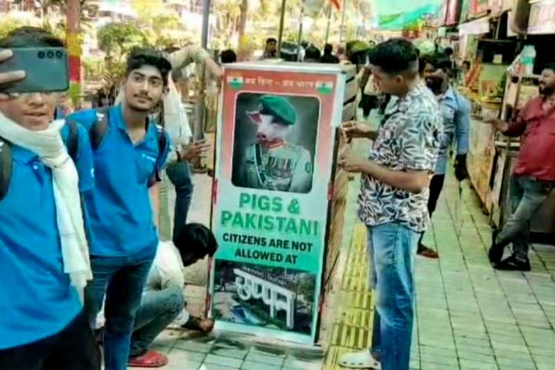 इंदौर: मंगलवार को जब पूरा देश पहलगाम में हुए आतंकी हमले पर शोक मना रहा था, उसी दौरान इंदौर में एक फूड स्टॉल के बाहर लगे साइनबोर्ड ने सबका ध्यान खींचा, जिस पर लिखा था, "छप्पन दुकान में सुअरों और पाकिस्तानी नागरिकों का प्रवेश वर्जित है।" इंदौर की मशहूर फूड स्ट्रीट छप्पन दुकान पर सुअर के चेहरे वाली पाकिस्तानी सेना प्रमुख असीम मुनीर की फर्जी तस्वीर छपी है। पोस्टर लोगों का ध्यान खींच रहा है और लोग सेल्फी लेने के लिए उमड़ पड़े हैं।