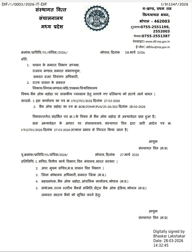 भोपाल। मध्य प्रदेश सरकार ने सार्वजनिक क्षेत्र के बैंक ऑफ बड़ौदा के खिलाफ बड़ा प्रशासनिक कदम उठाते हुए उसे 5 वर्षों के लिए ब्लैकलिस्ट कर दिया है।मध्य प्रदेश सरकार ने एक कड़ा कदम उठाते हुए सार्वजनिक क्षेत्र के बड़े बैंक, बैंक ऑफ बड़ौदा (BoB), को आगामी 5 वर्षों के लिए ब्लैकलिस्ट कर दिया है। शासन द्वारा जारी निर्देशों के बाद अब राज्य का कोई भी विभाग इस बैंक के साथ नया लेन-देन नहीं कर सकेगा। यह कार्रवाई मुख्यमंत्री किसान कल्याण योजना के ₹175 करोड़ से अधिक के फंड प्रबंधन में लापरवाही और निर्देशों का पालन न करने के कारण की गई है।