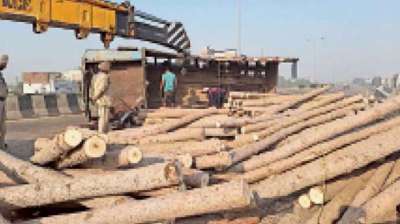 हाईवे पर लकड़ियों से भरा ट्रक पलटा, बाल-बाल बचा चालक
